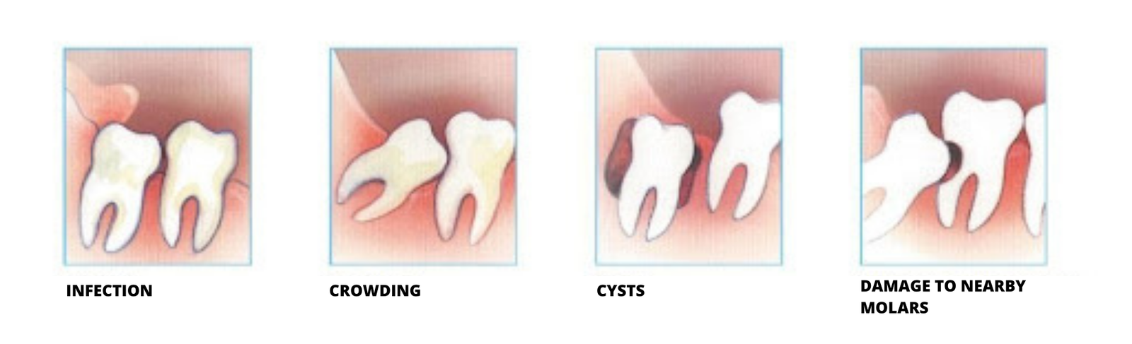 Wisdom tooth is nothing but the third molar and seen one at each end of the arch . Generally, there are four wisdom teeth present and they usually erupts at an age of 16 to 20 but sometimes it may erupt early or late. At times wisdom tooth erupts completely without interfering the adjacent tooth, soft tissue or bite, Whereas in some cases it erupts partially, disturbing the bite and soft tissue. It happens because of smaller jaw size due to which the tooth does not have enough room as a result of which they develop wrongly and become ‘impacted’. The Impacted tooth has to be removed as it will cause infection to the adjacent tooth and tissue.